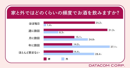家と外で飲む頻度をそれぞれ聞いたところ、家で飲む頻度は「週に数回」が31.3%、「ほぼ毎日」が25.2%と半数を超える人が週1日以上、家でお酒を楽しんでいるという結果に。一方、外での飲酒については「年に数回」の37.1%が最多となっており、「ほとんど飲まない」28.4%や「月に数回」24.8%と家飲みとは対照的な結果になりました。