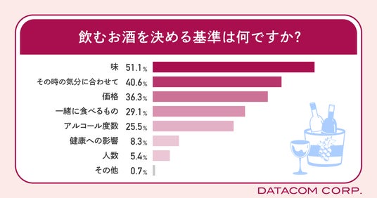 お酒を選択する基準については51.1%と半数以上の人が「味」で選ぶという回答になりました。