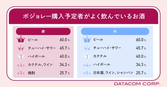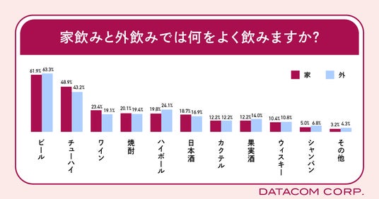 家飲みと外飲みでよく飲むお酒については、場所を問わずビール、チューハイは圧倒的な人気がありました。3位以降を見てみると、家ではワイン、外飲みではハイボールが次点に来ていました。