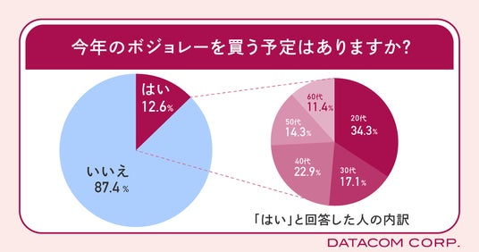 今年のボジョレーを購入する予定について、購入予定がある人は12.6%に留まりました。年代別の内訳を見てみると、20代が34.3%で最も多いという結果に。