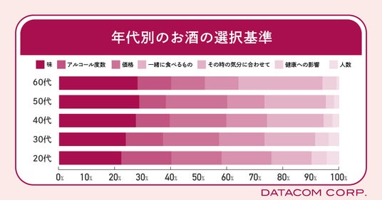 年代別に選択基準を見てみると、60代は「味」や「その時の気分に合わせて」といった嗜好を元に選択する傾向が強いようです。一方で、20~30代では「価格」や「アルコール度数」といった味や気分以外の要素の割合が高くなっていました。
