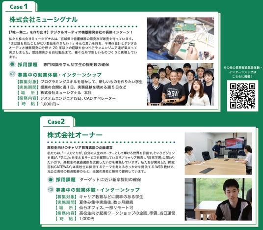 就活・転職お役立ちポータルサイト「仙台で働きたい!」内に本事業専用サイトを設け、大学等低学年から参加できる有給就業体験・インターンシッププログラムを多数掲載しています。