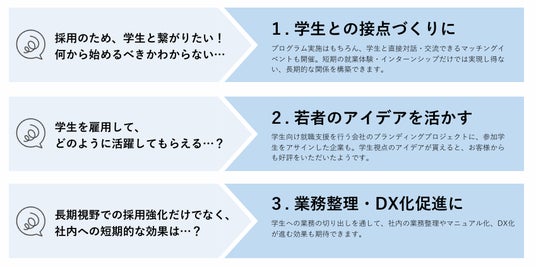 学生、企業相互の理解を促進することで、地域企業への就職及び就職後のミスマッチを防ぎ人材定着につなげることを目指します。