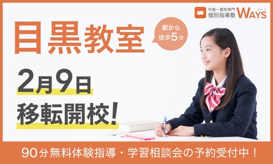 中高一貫校生の成績アップを専門とする「中高一貫校専門 個別指導塾WAYS」(運営:株式会社メイツ、本社:東京都新宿区)は、2025年7月に在籍生徒数が100名を突破するなど多くの支持をいただいている「目黒教室」を、来る2026年2月9日(月)より、同エリア内で拡大移転いたします。 今回の移転により座席数・学習環境をアップデートし、2026年の早いのタイミングで、中高一貫校生が心機一転、学習に没頭できる最適な環境を提供します。