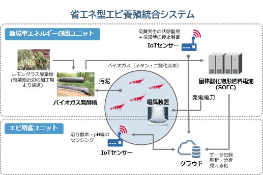 本システムは、養殖の汚泥と現地で生産されているレモングラスの廃棄物を混合したバイオマスから生成されるバイオガスを燃料とした固体酸化物形燃料電池(以下、SOFC)を活用して発電するもので、SOFCによるエビ養殖は日本発の取り組みとしては初めてのケースとなります。