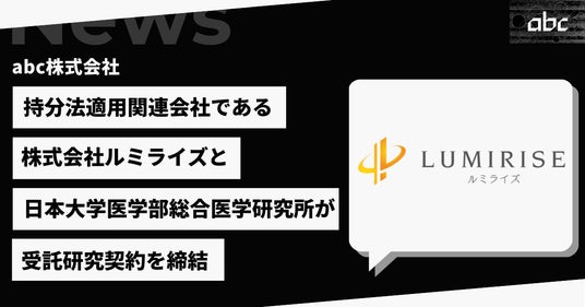 abc株式会社(本社:東京都港区、代表取締役:松田 元、証券コード:8783、以下「当社」)の持分法適用関連会社(株式35.99%を保有)である株式会社ルミライズ(本社:東京都中央区、代表取締役:菅原 広隆、以下「ルミライズ社」)は、日本大学医学部総合医学研究所(所在地:東京都板橋区、以下「日大医学部総研」)とヒト脂肪組織からの脱分化脂肪細胞(DFAT)の静脈投与の安全性に関する研究委託契約を締結いたしました 。