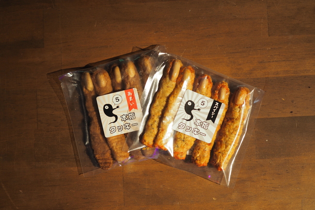 5周年記念の手ぬぐいは、館長・柳生忠平のオリジナル妖怪で妖怪美術館のキャラクターでもある「みちしるべぇ」と「ちびしるべぇ」がデザインされています。また、毎回、発売のたびに大人気の妖怪の指のような「指クッキー」は、5周年を記念した特別パッケージで「妖怪bar」にて販売します。