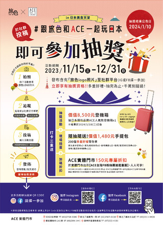 1940年創業の日本の総合バッグメーカーで、トラベルからビジネスまで幅広い種類のバッグを提供し、数々のヒット商品を輩出するACE。日本におけるバッグのリーディングカンパニーとして、米国をはじめ、アジア中東欧まで、世界へと発信しています。観光需要が回復する中、高知県やタイ国政府観光庁とコラボしたキャンペーンを実施するなど、観光業界に貢献するACEと地域活性化を目指す「旅色」のコラボが決定いたしました。清水SAエリアを活用したキャンペーンイベントの第1弾として行う、湯浅町およびACEとのコラボキャンペーンでは、11月15日~12月31日まで、清水SAにて指定の内容をSNSにご投稿いただき、現地にて抽選に参加いただくと、ACE商品のスーツケース(8,500元相当)やNEXCO中日本オリジナルキャラクター「みちまるくん」のハンドバッグ、清水SAのフードコートで使用できるコーヒーやソフトクリームの引換券などが総勢201名様に当たります。また、参加いただいた方全員に台湾のACE取り扱い店舗で利用できる150元の割引券をプレゼント。詳細はキャンペーンページにてご覧ください。