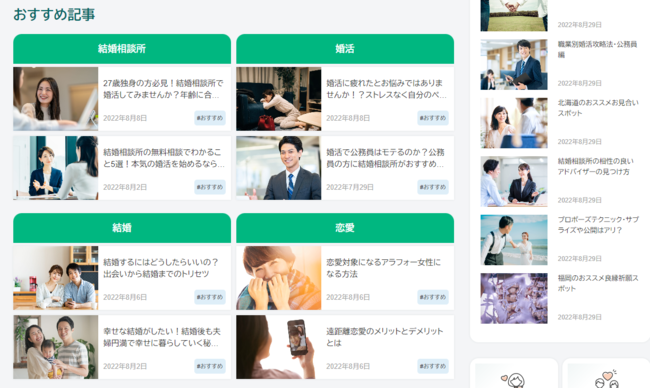 コラムページは「結婚相談所」「婚活」「結婚」「恋愛」の4つの要素から構成するページとなってなっており、婚活ノウハウを熟知した私たちからの正しい情報をお伝えする情報提供メディアとなります。