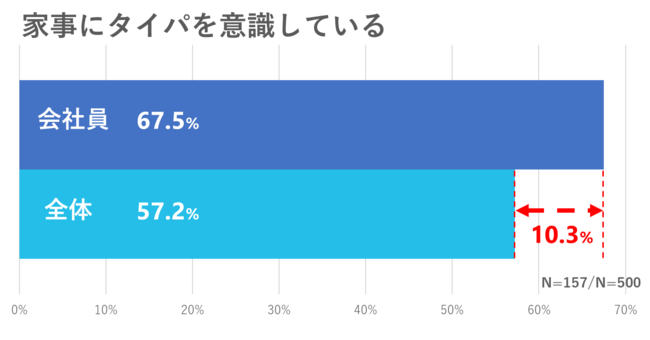 1.家事に“タイパ”は必要?57.2%が家事に対してタイパを意識しており、特に会社員のタイパ意識は67.5%と10ポイントも高い結果に!