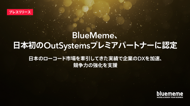 株式会社BlueMeme(ブルーミーム、本社:東京都千代田区、代表取締役社長:松岡 真功、以下 BlueMeme)は、2023年7月、OutSystems社が認定する販売代理店制度において、日本初のプレミアパートナーとして認定されました。