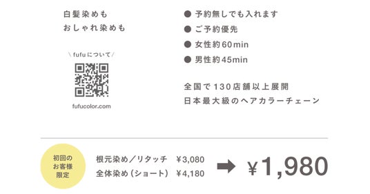 fufuを初めてご利用いただく方全員に、根元染め(リタッチ)税込3,080円&全体染め(ショート)税込4,180円を、税込1,980円でご提供いたします。