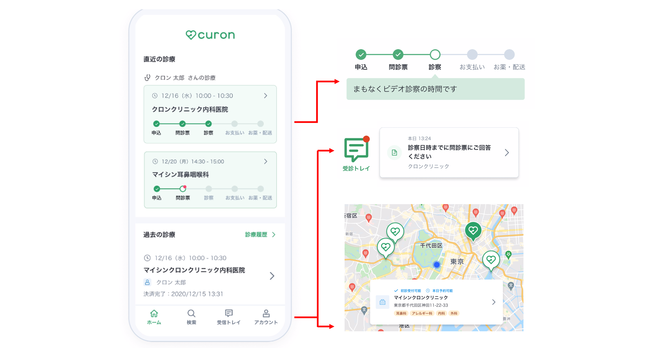 オンライン診療サービス クロンは、医療機関の検索、予約、問診、ビデオ通話による診察、決済、処方箋または薬の受け取りまでがオンライン上で行うことができるサービスです。医療機関の導入数は現在5,000施設以上にのぼり、当社が5,000店舗以上の薬局向けに提供するサービス「curonお薬サポート」と連携することで、オンライン服薬指導、薬の配送手配までクロン上で完結することができます。