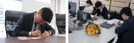 写真左:メッセージを書く山田代表 写真右:メッセージを書く新入社員の皆さん