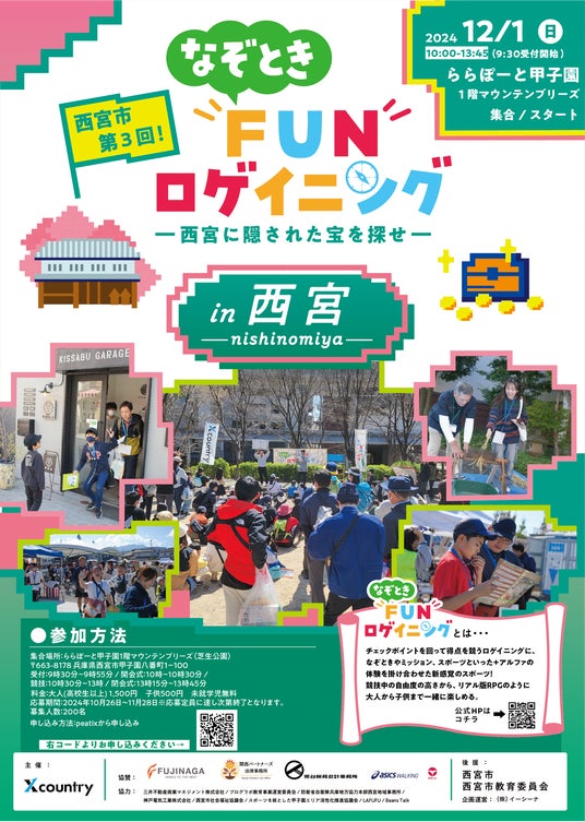 株式会社Xcountry(本社:東京豊島区、支社:兵庫県西宮市)は、ゲーム感覚で街を巡って楽しむ『なぞときFUNロゲイニング』を、12月1日に兵庫県西宮市のららぽーと甲子園芝生広場にて開催する。西宮市での開催は2023年春以来。専用アプリを活用することで、よりお楽しみが増える。