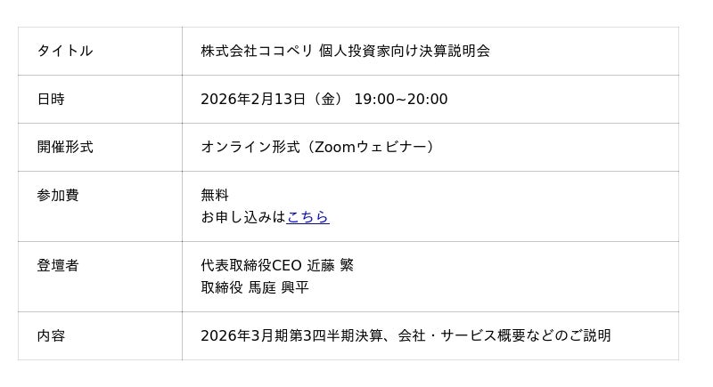 ココペリは、オンライン形式にて個人投資家様向け会社説明会を開催します。