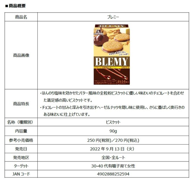森永製菓株式会社(東京都港区芝、代表取締役社長・太田 栄二郎)は、森永ビスケットシリーズから、贅沢な味わいのビスケット「ブレミー」を9月13日(火)より全国にて発売いたします。3月から、首都圏・関東信越限定で販売しておりますが、大変ご好評いただき、この度全国に拡大して発売となりました。