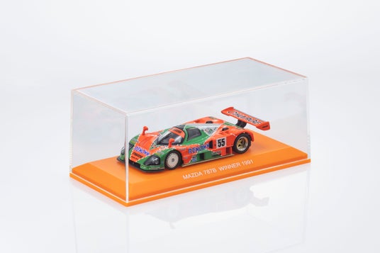 1991年の第59回ル・マン24時間レースにおいて、日本車初、さらにロータリーエンジン搭載車として世界で初めて総合優勝を飾ったグループCマシンを商品化しました。カウルのデザインやウイングのディテール、アルミホイールの形状のほか、各種ステッカー類も忠実に再現しています。そのクオリティは非常に高く、マツダファンはもちろん、コアなレーシングカーマニアも満足する仕上がりになっています。