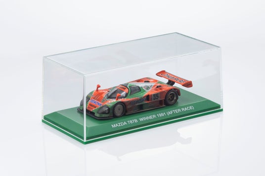 京商オンラインサイトでは、特別な塗装を施した「MAZDA 787B AFTER RACE」を500台限定で発売。レース後を再現するべくウェザリング塗装を施した仕様で、激闘を制した姿が机上で蘇ります。台座も標準仕様がオレンジなのに対しこちらはグリーンとなっており、コレクターアイテムとしてもおすすめです。(AFTER RACEウェザリング仕様はミニチュアカー単品販売となります。)