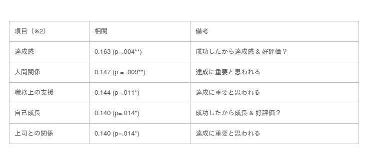 しかし、本調査においては、十分に意味のある値だと考える。なぜならば、エンゲージメントが高いとき、生産性や評価が高いことが期待されるが、実際には生産性は外部要因によって非常に大きく変化するからである。そのため、むしろ相関係数が0.3、0.5という大きな数値を取ることは考えがたい。