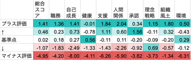 ※表1 考課結果とエンゲージメントのクロス集計表(平均値との差分)