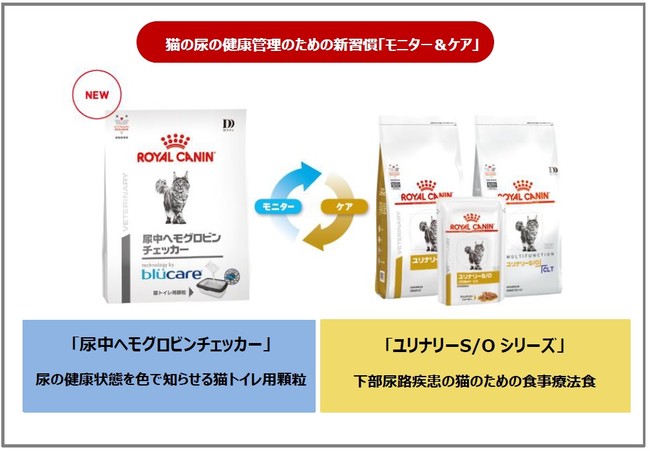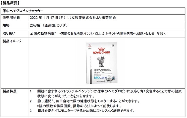 犬と猫を真の健康に導くヘルスカンパニーとして、栄養学に基づいたプレミアムペットフードおよび食事療法食を展開するロイヤルカナン ジャポン(本社:東京都港区、社長:山本 俊之)は、猫の尿の健康管理のため、猫用トイレに顆粒を混ぜ、色の変化によって尿の健康状態の変化を可視化できる画期的な新製品「尿中ヘモグロビンチェッカー」を発売します。本製品は、ロイヤルカナンで初のペットフードカテゴリ―以外の製品として、2022年1月17日、共立製薬株式会社より出荷開始となります*1。