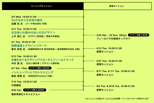 その後、共鳴する問いや世界観を持つ仲間とチームを組み、インタビューリサーチやフィールドワーク、プロトタイピング等を進めながら探索を深め、プログラムの最後には探索プロセスや成果を公表するエキシビションを開催予定です。