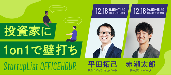 「StartupList オフィスアワー」とは資金調達に関する相談から事業内容に関する相談まで、気軽にベンチャーキャピタリストへマンツーマンで壁打ちができるイベントです。 当イベントでは、株式会社サムライインキュベートから平田拓己氏、株式会社ドーガン・ベータから赤瀬太郎氏をキャピタリストとしてお招きしました。