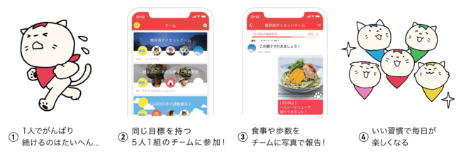みんチャレはダイエットや運動、学習、家事・仕事など、新しい習慣を身につけたい5人1組でチームとなり、チャットで励まし合いながら継続を目指す三日坊主防止アプリです。
