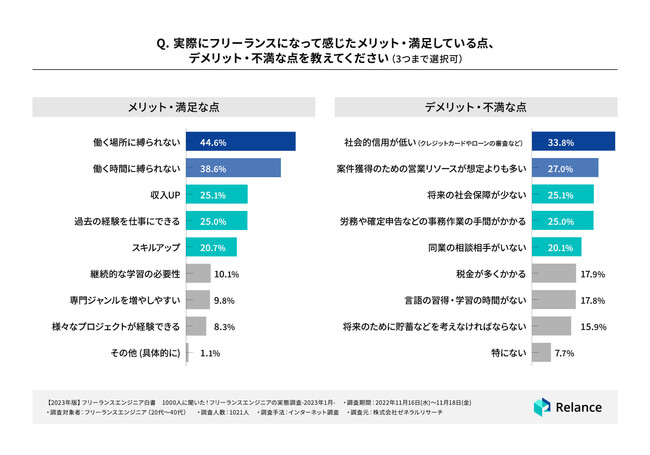 実際にフリーランスエンジニアになって感じている満足・不満足かをそれぞれ「実際にフリーランスになって感じたメリット・満足している点を教えてください(3つまで選択)」「フリーランスエンジニアになって感じたデメリット・不満な点を教えてください(3つまで選択可)」という設問で調査しました。