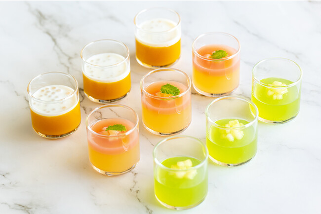その他にも、ひんやりとしたグラススイーツやシャーベットなどお好きなだけお召し上がりいただけます。夏本番に旬を迎えるみずみずしいピーチを使用した、「ピーチとバニラのゼリー」や「ピーチシャーベット」など桃好きも満足のひんやりスイーツもラインナップ。今しか食べることのできないパティシエ特製スイーツの数々をお楽しみいただきます。