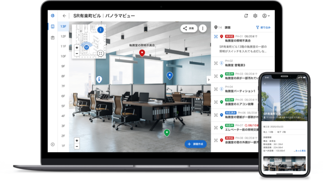 『ゲンコネ』は施設・建物ごとに施設情報やタスク管理・共有することができるクラウドアプリケーションです。タスクに紐づいたチャットツールを通し、関連各所とのやり取りを履歴として残すことが可能です。また、360°パノラマ上で課題を管理することができ、現場の往訪を最小限にすることができます。