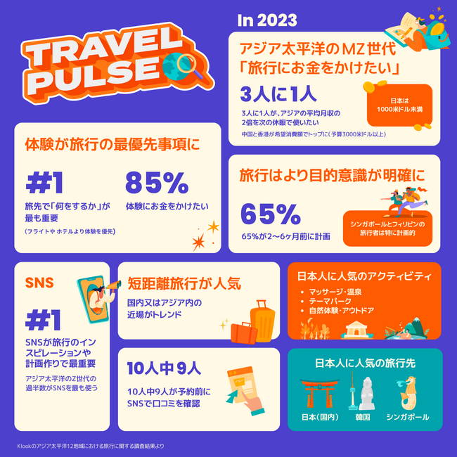 Klookの共同創業者兼COOのエリック・ノック・ファーは、「旅行の新時代を迎え、体験は次世代の旅行者、特にミレニアル世代とZ世代の間で、新しい重要通貨として出現しました。ユニークな体験やアクティビティは、旅行プランの中で彼らが最初に注目するものとして優先されており、旅行者の85%が休暇中に体験に投資することを望んでいます。この顕著な変化は、本物の体験に対する彼らの欲求が高まっていることの証しであり、彼らの決断は、次の旅行の冒険に乗り出す前に、検索エンジンや旅行ガイドのような従来の情報源よりもSNSによって後押しされています」と述べました。
