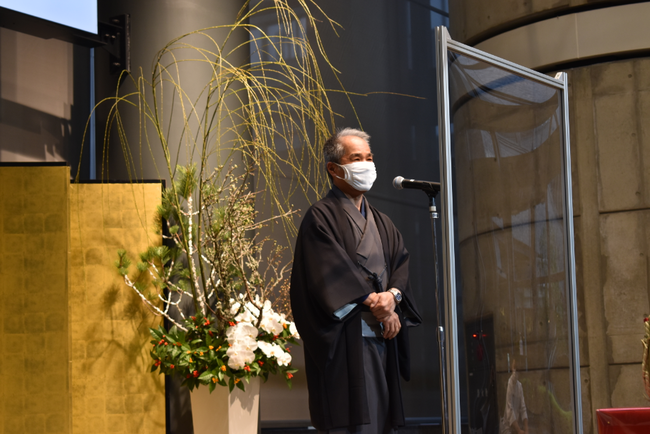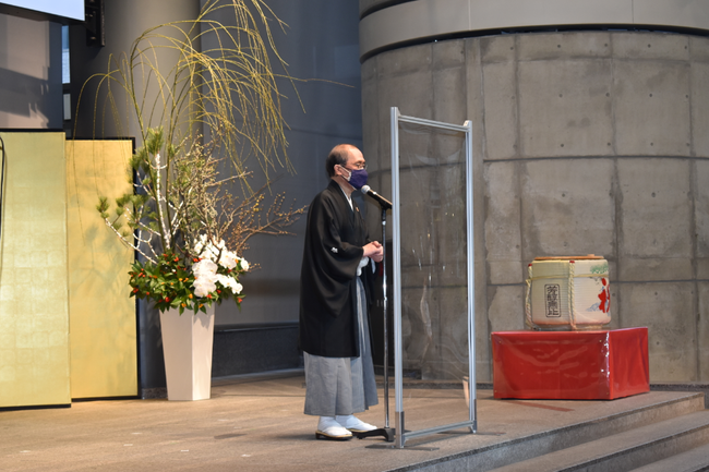 京都リサーチパーク株式会社(代表取締役社長 小川 信也)は、2022年1月11日(火)、京都リサーチパーク(以下、KRP地区)東地区アトリウムにて「KRP地区賀詞交歓会2022」を開催しました。門川大作京都市長にも来場いただき、KRP地区内のご入居企業・産業支援機関や関係機関の皆様と共に新年の門出を祝いました。2年ぶりとなった賀詞交歓会は昨年からの新型コロナウイルス感染状況を鑑み、規模を縮小するほか、エアー鏡開きやエアー乾杯など工夫をこらしました。2020年度以降、KRP地区に入居された企業の皆さまを紹介する場もあり、久しぶりの地区内交流の時間となりました。