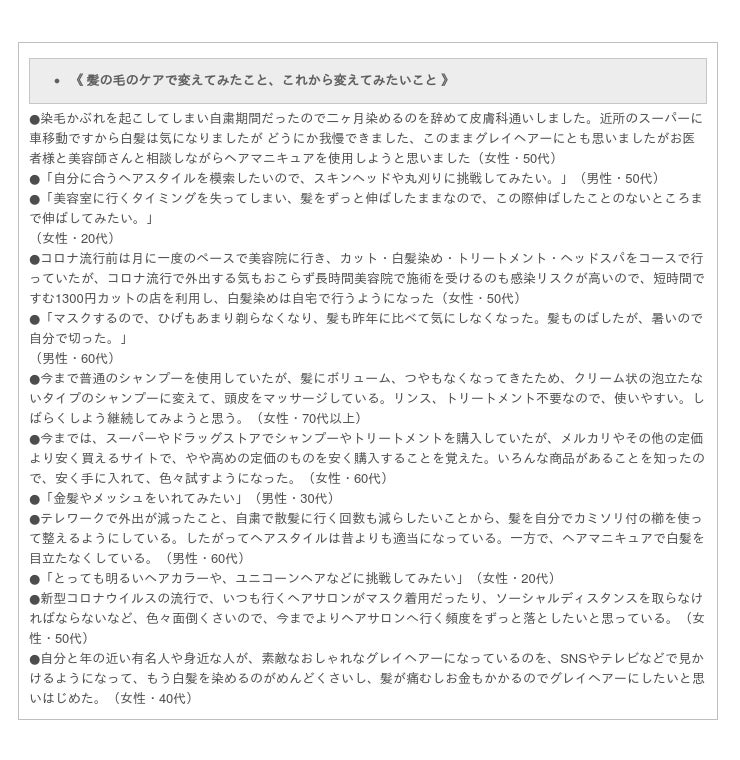 先ほどと同じ質問に対する自由回答を見ると質的な変化が見てとれました。「外出が減り、浮いたお金で高級なシャンプー、コンディショナーを使うようになった。」(女性・40代)「これを機会にいろんなシャンプーやリンスを試してみようと思いました。」(男性・30代)のように、新型コロナウイルス流行を機会に、ヘアケアにお金をかける傾向の記述も見られます。その一方で、「収入が減り、節約のために思い切り短くカットして、しばらくは美容院に行かないですむようにした。」(女性・50代)「髪を切る機会を逸してしまい、伸ばしている。マスクをしていると、顔がほとんど隠れてしまうので、髪形や化粧にお金をかける気にならなくなった。」(女性・50代)というように、ヘアケアにお金をかけない層も一定数見られました。