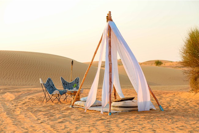 ドバイ砂漠保護区の中心に位置し、花のアーチ、スタイリッシュなティーピーテント、クッションシート、リラックスできるハンモックなど、ゆったりとくつろぐ環境が整っています。周囲と調和するように設計された当施設では、砂漠のドラム演奏、サンドボード、鷹との触れ合い、アーチェリーなどのアクティビティが楽しめるほか、砂丘からのサンセットを撮影できるオプションツアーも用意しています。