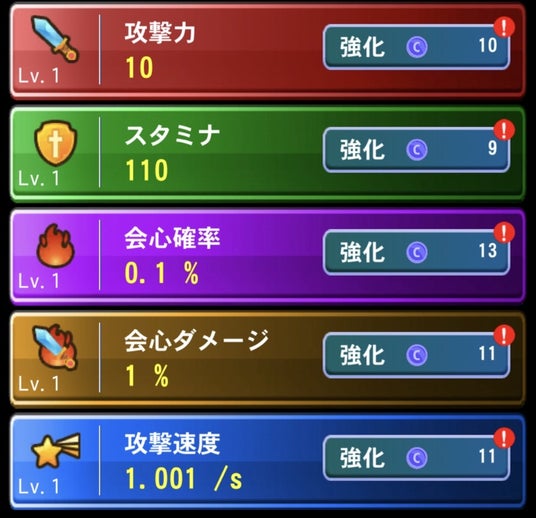 攻撃力、スタミナ、会心確率、会心ダメージ、攻撃速度の5つのパラメーターがあります。