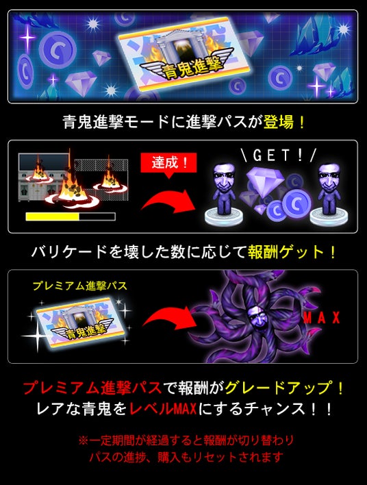 青鬼進撃では破壊した拠点の数によって報酬がもらえる「進撃パス」が登場します。