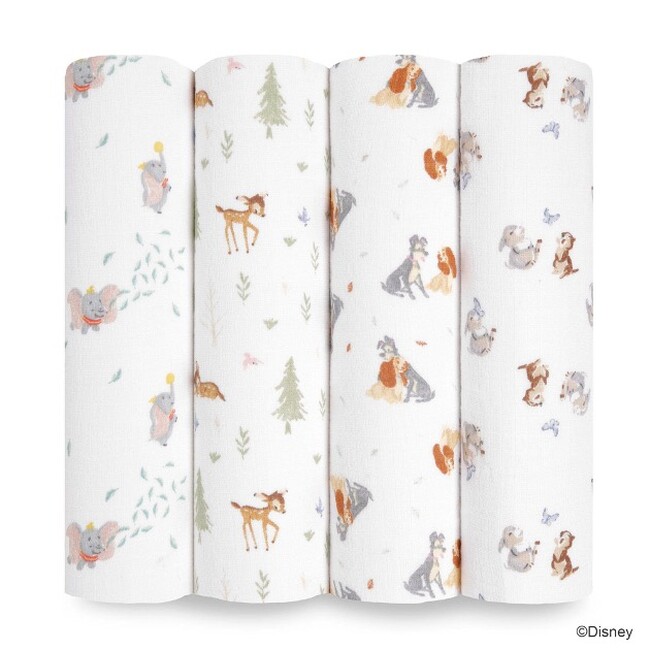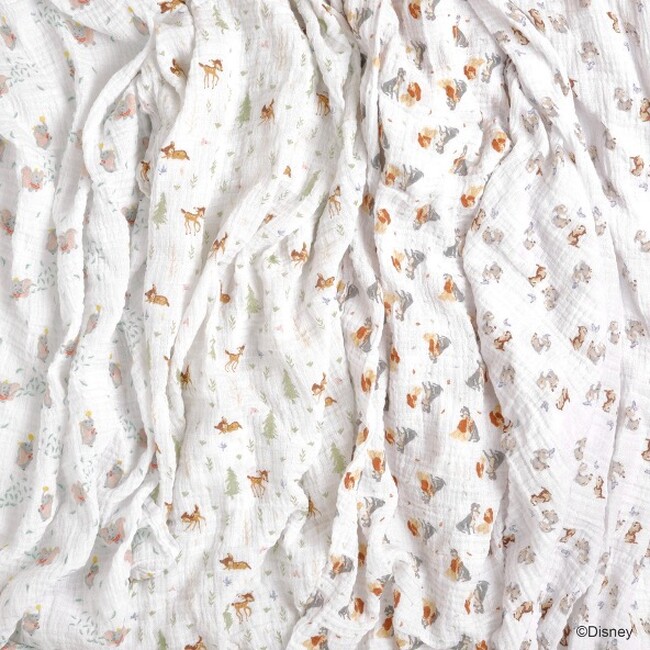 今年100年周年を迎えるディズニーは、長年にわたり多くの人から愛され続けています。エイデンアンドアネイでは2016年よりディズニーデザインを手掛けており、発売当初よりご好評をいただいています。今回の新作はたくさんのディズニーコレクションの中から人気の「バンビ」や「ダンボ」、「わんわん物語」などのキャラクターたちが大集結。森をイメージしたソフトでニュートラルな色合いの中で遊びまわるデザインです。⾚ちゃんはもちろん、子育てに関わる大人たちにとっても馴染みあるディズニーキャラクターたちの可愛らしいイラストに癒されるようなアイテムで、出産祝いや準備品としても最適です。