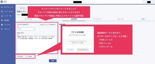 また、上記8タイプのほか、希望のプロンプトを手動で入力することも可能であり、企業独自の視点による幅広いVOC分析・活用が可能となります。なお手動入力時は、通話録音データとあわせて、HTMLファイル・PDFファイル・テキストデータを補足情報としてアップロードすることができ、音声認識ファイルに縛られない多角的なVOC分析・活用を実現します。