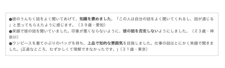 連絡や会うペースを相手に合わせ、会っているときは聞き役に徹し、不必要な詮索はしないというエピソードが多数ありました。慎ましい女性を演じ、弁護士男性が気分良く過ごせる雰囲気を作ることが、「この人と付き合いたい」と思わせることに繋がるのかもしれません。