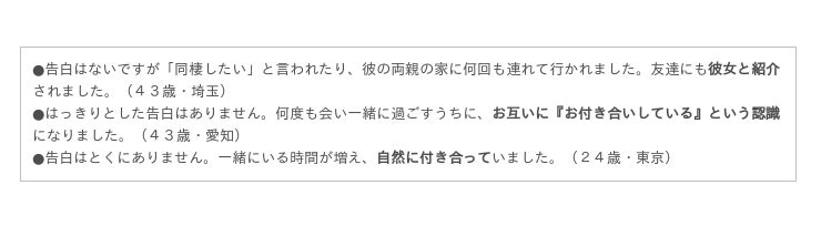 告白はなくても、自然とお付き合いに発展したというケースは14.3%でした。弁護士の彼の両親に会ったり、友達に「彼女」と紹介されたりするなど、交際の事実を確認できるようなエピソードもありました。ただし、一方的に付き合っていると勘違いしないためにも、不安な場合は確認した方が安心かもしれません。