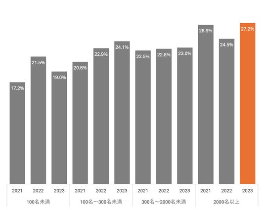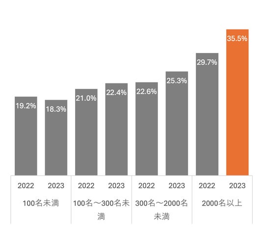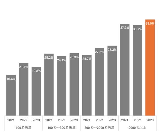 新しい市場への取り組みや新規事業に力を入れる企業が増加しています。特に、従業員2,000名以上の大企業では、新規事業への取り組みが2022年の一時的に下がりましたが、2023年には再び上昇傾向を示しています。また、新規事業立ち上げに対する従業員の興味も同様に増加しています。