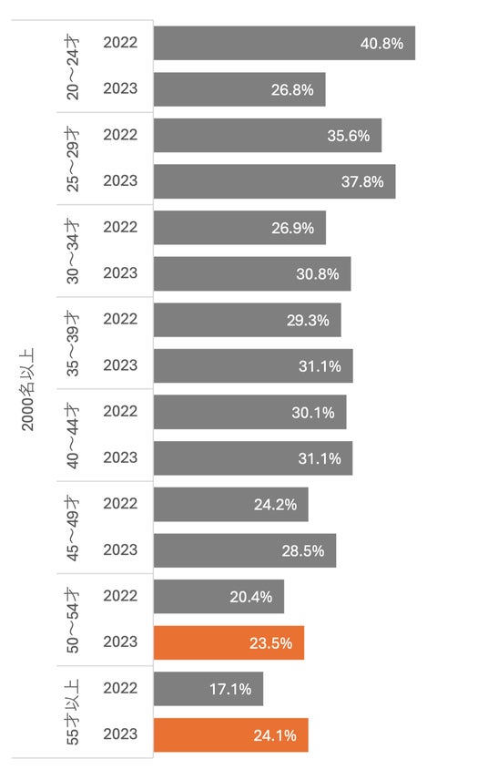 さらに、2022年と比較して、新たな学びへの挑戦は20~24歳を除く全年齢層で増加しており、50代以上で特に目立った伸びを示しています。これは、特に大企業で、学習環境の促進が影響していると考えられます。