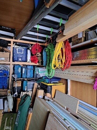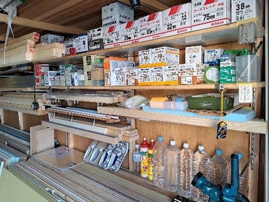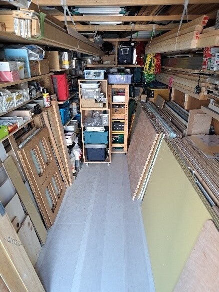 仕事道具の木材や資材を収納しています。背面ガチャ柱を使って棚を設置することで、棚の柱が前面に出ず、すっきりとした見た目を実現しました。また、タル木を使って頭上のスペースを有効に活用し、薄物収納として工夫しています。特に便利なのが、キャスター付きの可動式ラック棚で、部屋の前後の空間を調整しつつ、一時的に外に出したり、自由に移動できるため、収納物の出し入れが非常にスムーズです。収納物が年々増えてしまうため、4帖の自宅スペースから、思い切って8帖サイズのトランクルームへと収納場所を拡大しました。広い空間を有効活用してさらなる収納力を確保しています。