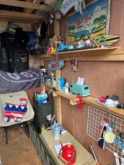 また、木枠を組んだ自作の壁面収納棚を設置し、収納力をアップさせています。細々としたグッズ・趣味のコレクションも多いため、網を利用した「掛ける収納」を取り入れることで、スペースをさらに整理しやすくしています。契約したいと思い立った時はちょうど満室で、空きが出るのを待ちわびていました。契約後は時々整理をしようと思いながらも、物がさらに増えても収納できるように工夫を重ねています。