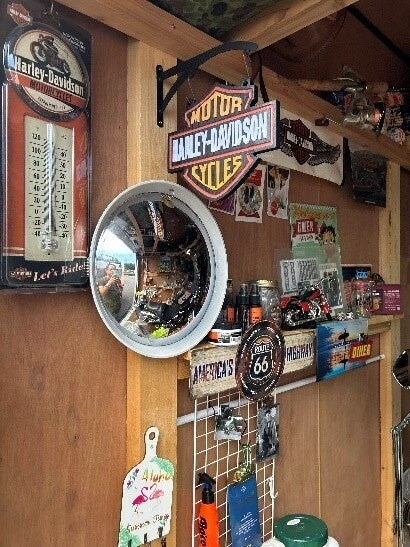 大型バイクを収納しており、まっすぐに停めるとスペースに収まらないため、斜めに停め、アルミ板を使ってリアタイヤを動かすことでシャッターを閉められるように工夫しています。