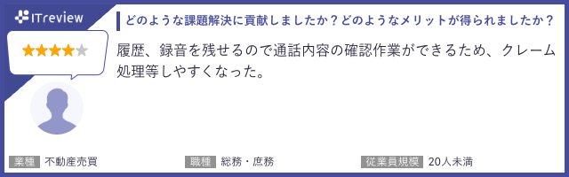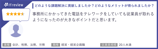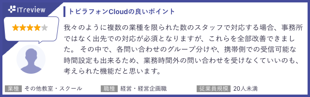 「トビラフォン Cloud」は「ITreview」で平均顧客満足度4.2を獲得しています(2023年10月18日時点)。当製品のご利用者様から実際に寄せられたレビューを一部ご紹介します。