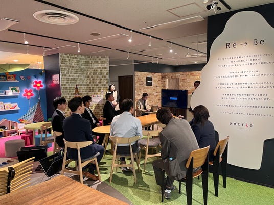 当日は、ホームテックが手掛けるブランド『リフォームプライス』『entrie(エントリエ)』を中心に視察しました。最初に視察をさせて頂いたのはリノベーションブランド『entrie』。同社で執行役員を務める北島様からのご講演やモデルルームのご案内をしていただきました。参加者の皆様には、高単価リノベーションにおける戦略や『entrie(エントリエ)』のコンセプト設計を実物を見ながら視察をしていただき大変ご好評をいただきました。