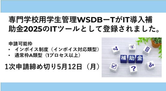 専門学校用学生管理システムWSDB-TがIT導入補助金2025のITツールとして登録されました(開発会社:東和ソリューションエンジニアリング株式会社で登録)